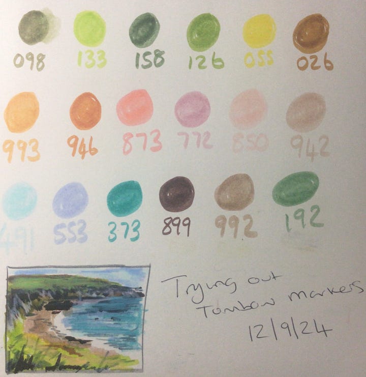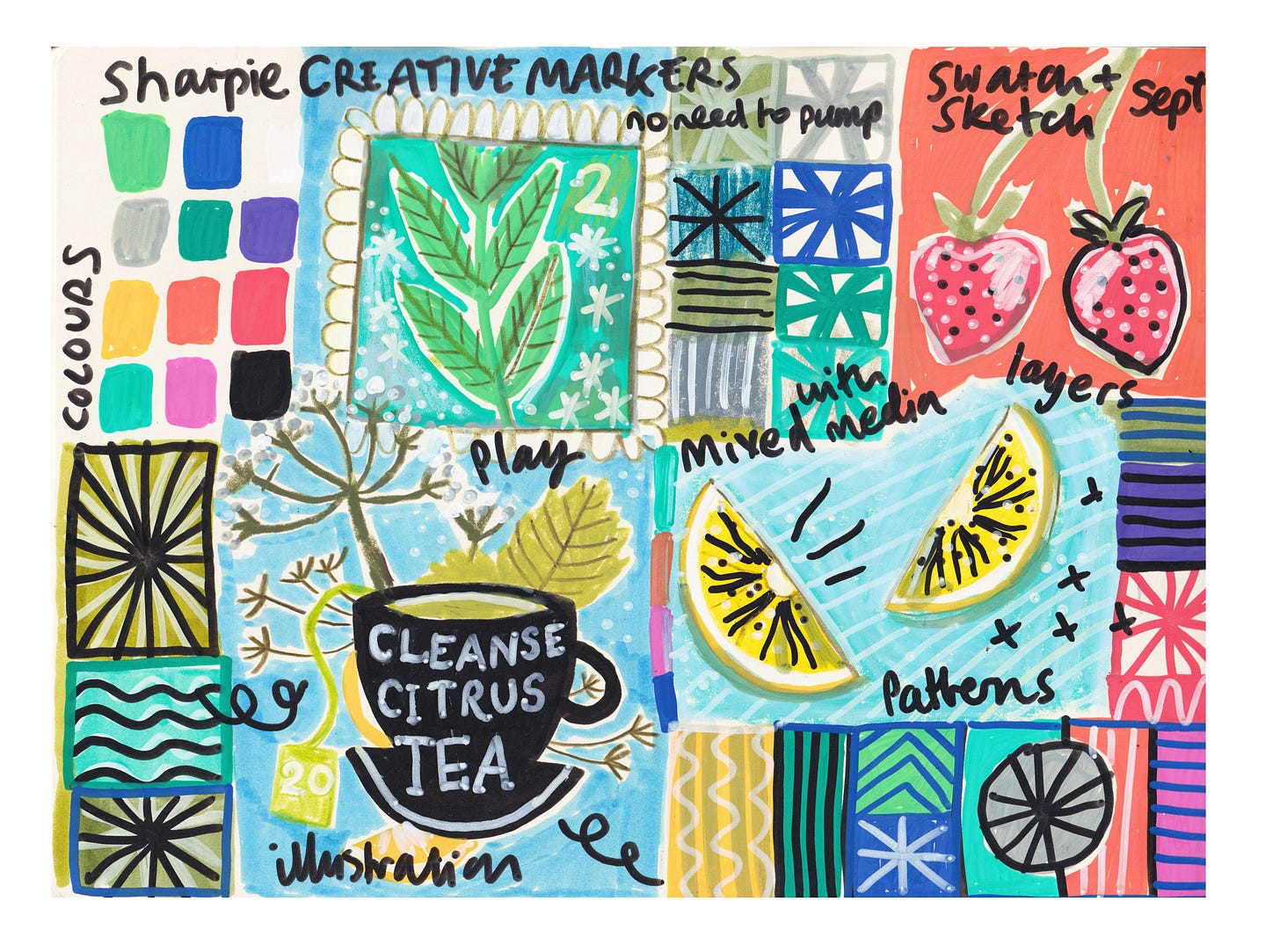 Below is my very garish sketchbook page I started swatching the last time we met and finished a few days after with the new-to me Sharpie Creative markers.